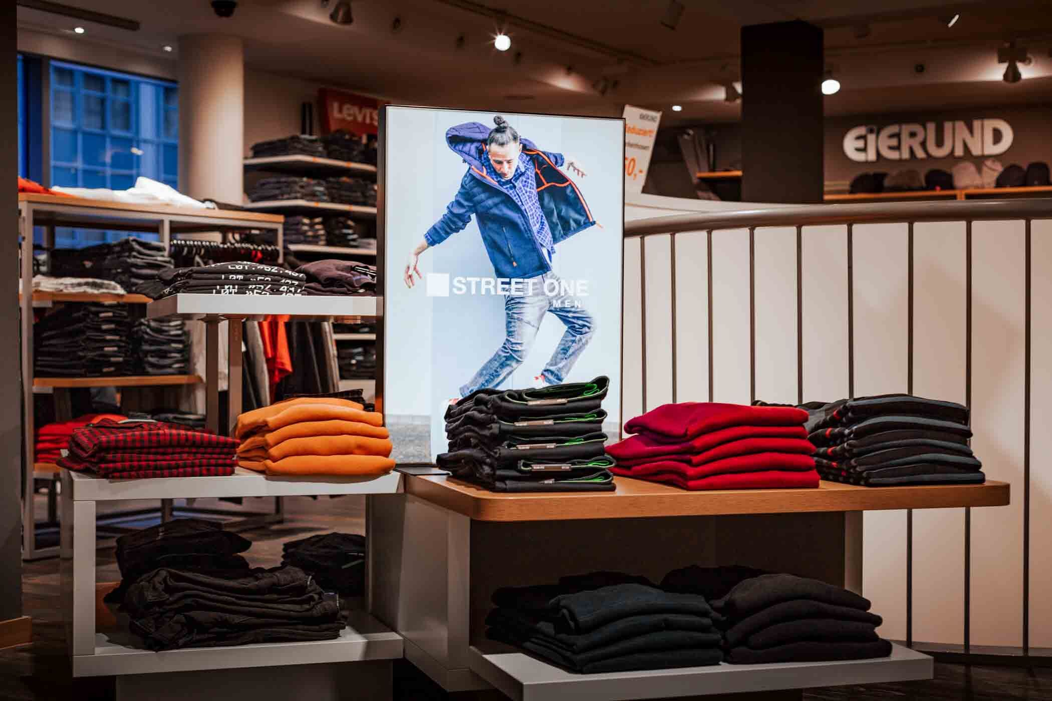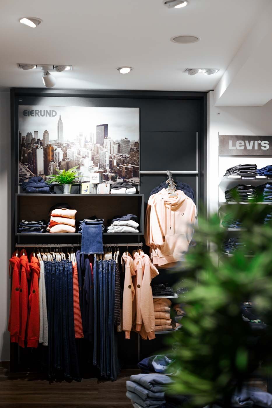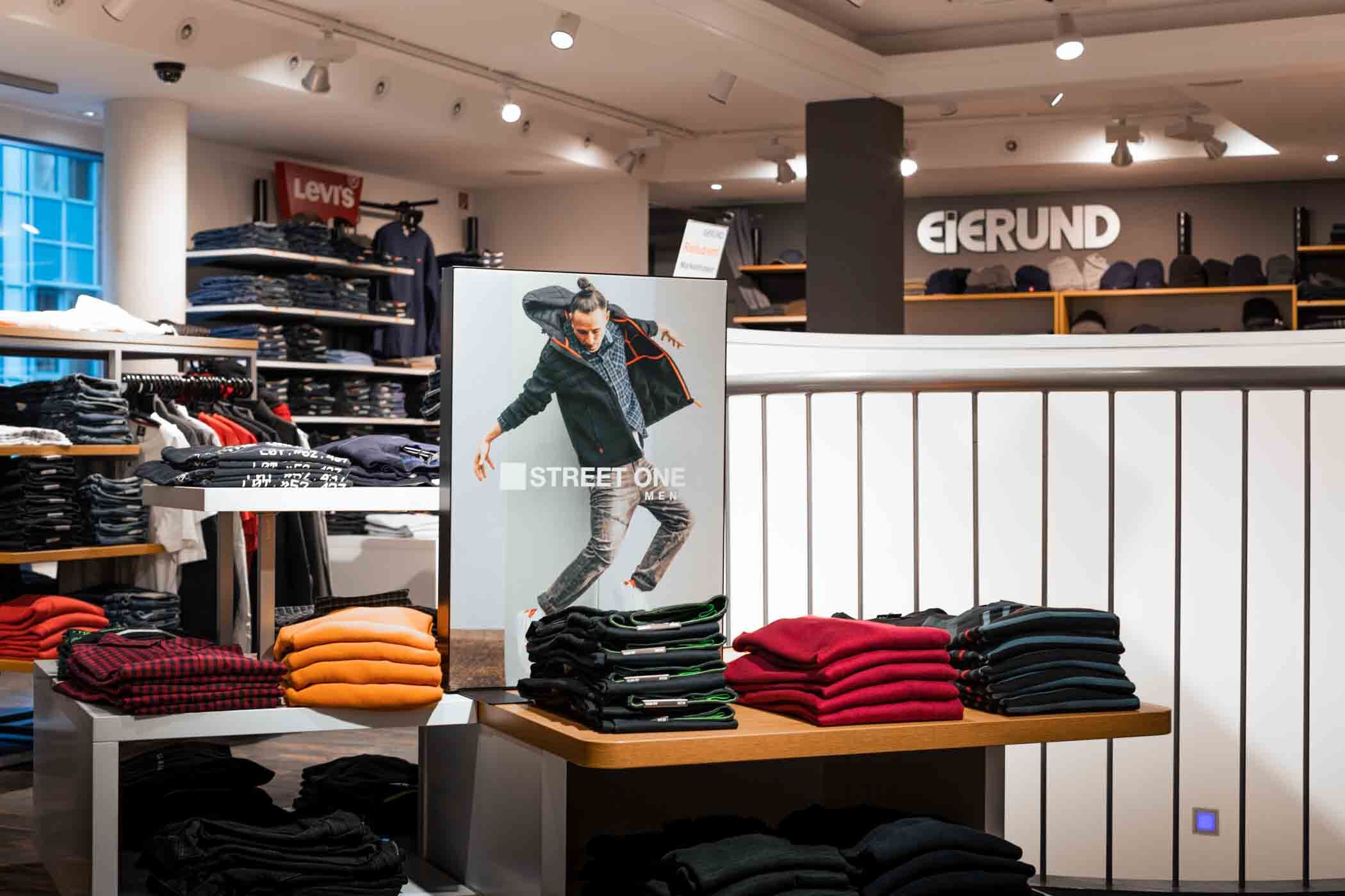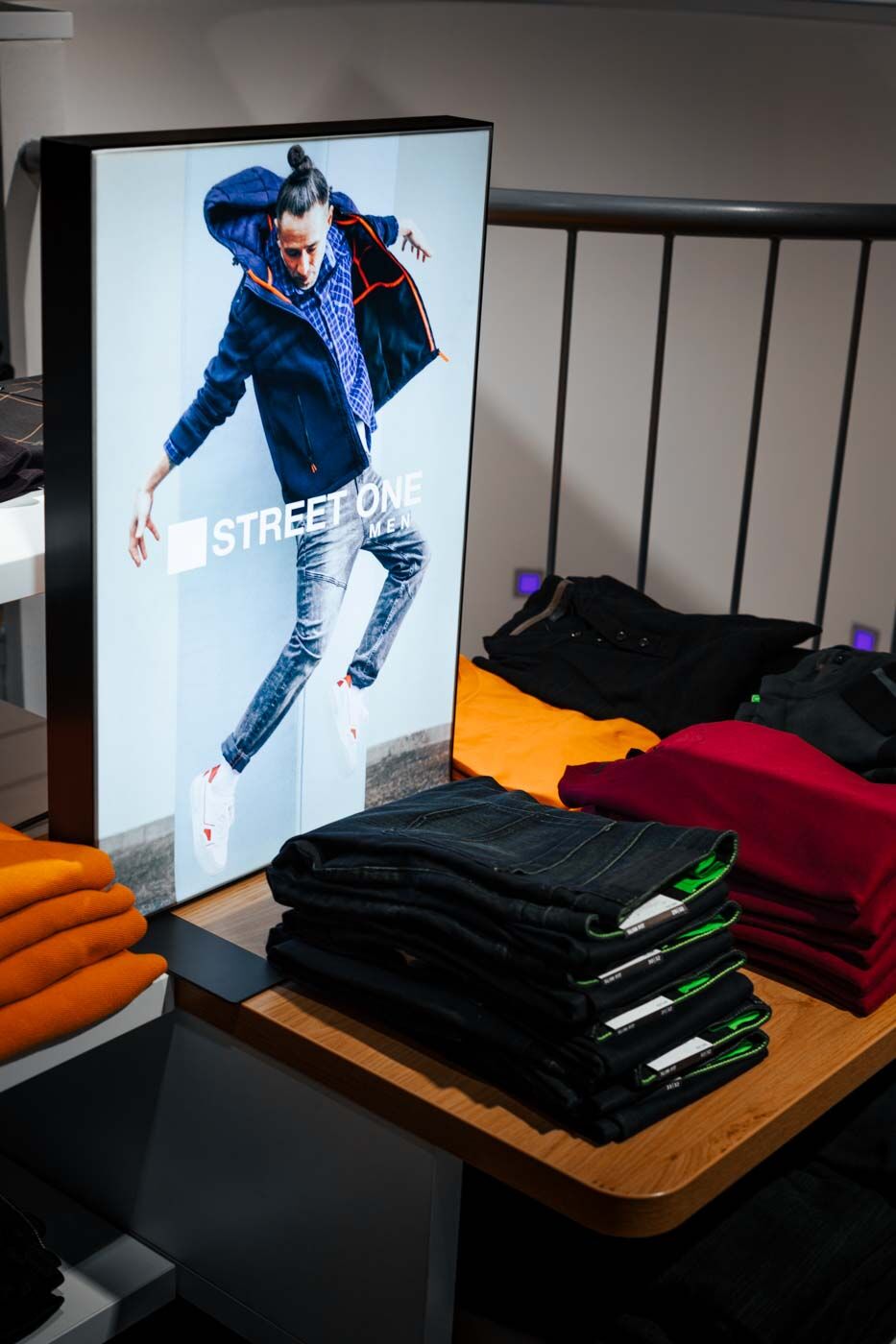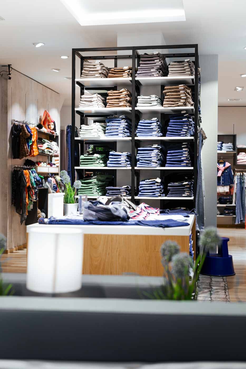 Unsere Damenabteilung im Erdgeschoss empfängt Sie mit der aktuellsten Mode. Sie können ganz entspannt durch die nach Farben sortierte Kleidung stöbern - oder finden Sie an der riesigen Jeanswand Ihre perfekte Hose! Haben Sie eine Begleitung dabei, kann diese in einer der gemütlichen Sitzecken Platz nehmen.